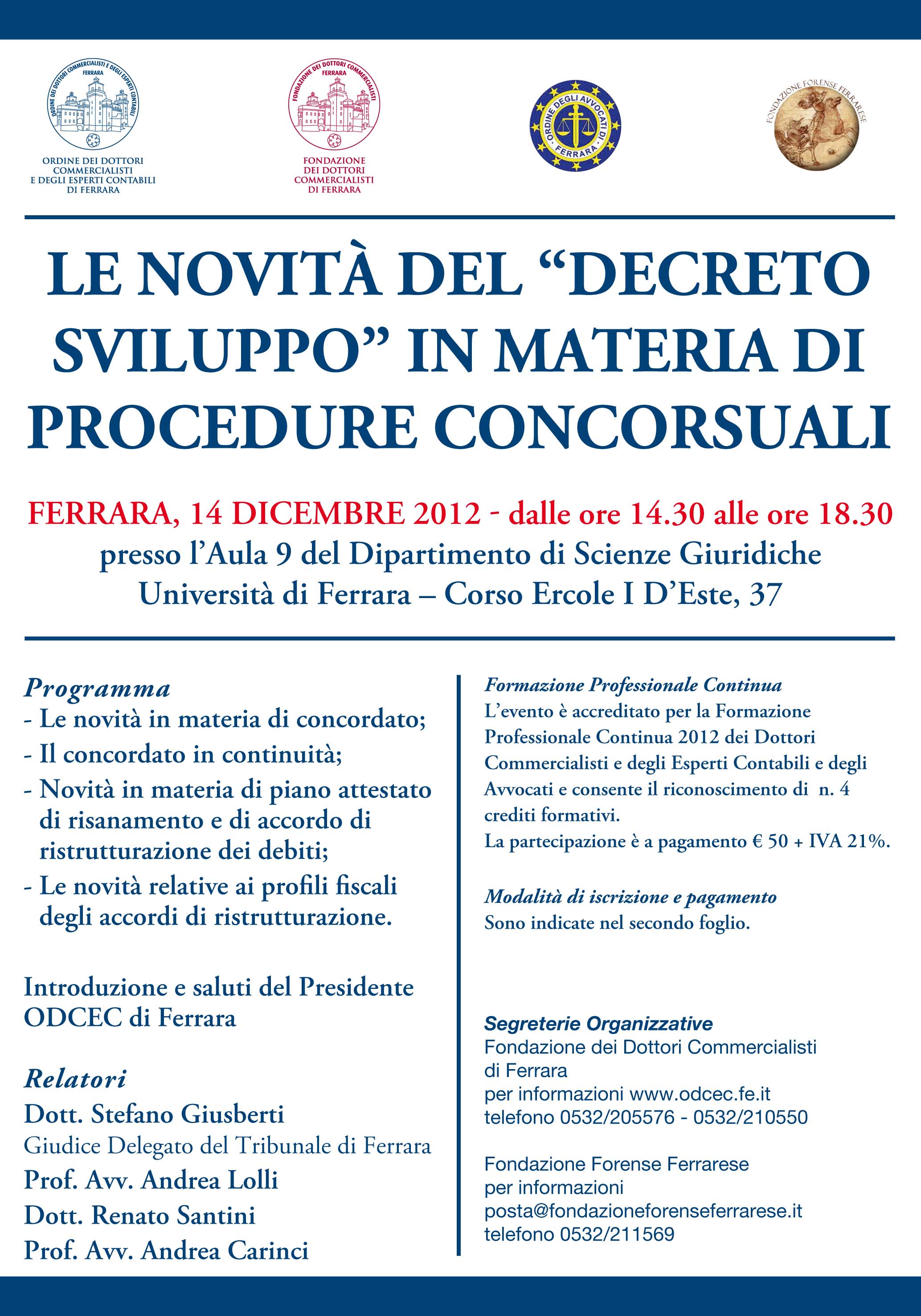 Il Convegno si terrà il 14/12/12 presso l'Aula 9 C.so Ercole I° D'Este n. 46 - Dipartimento di Scienze Giuridiche dell'Università di Ferrara, dalle ore 14,30 alle 18,30 e nasce da una collaborazione tra l'Ordine dei Dottori Commercialisti ed Esperti Contabili di Ferrara e l'Ordine degli Avvocati di Ferrara.